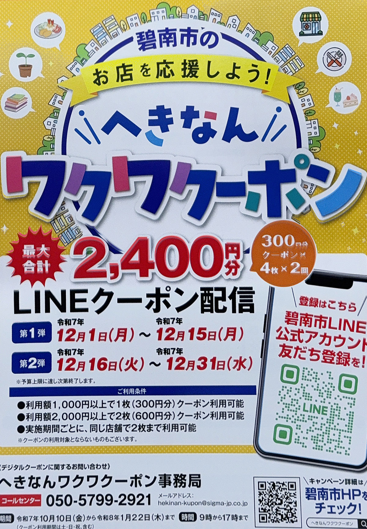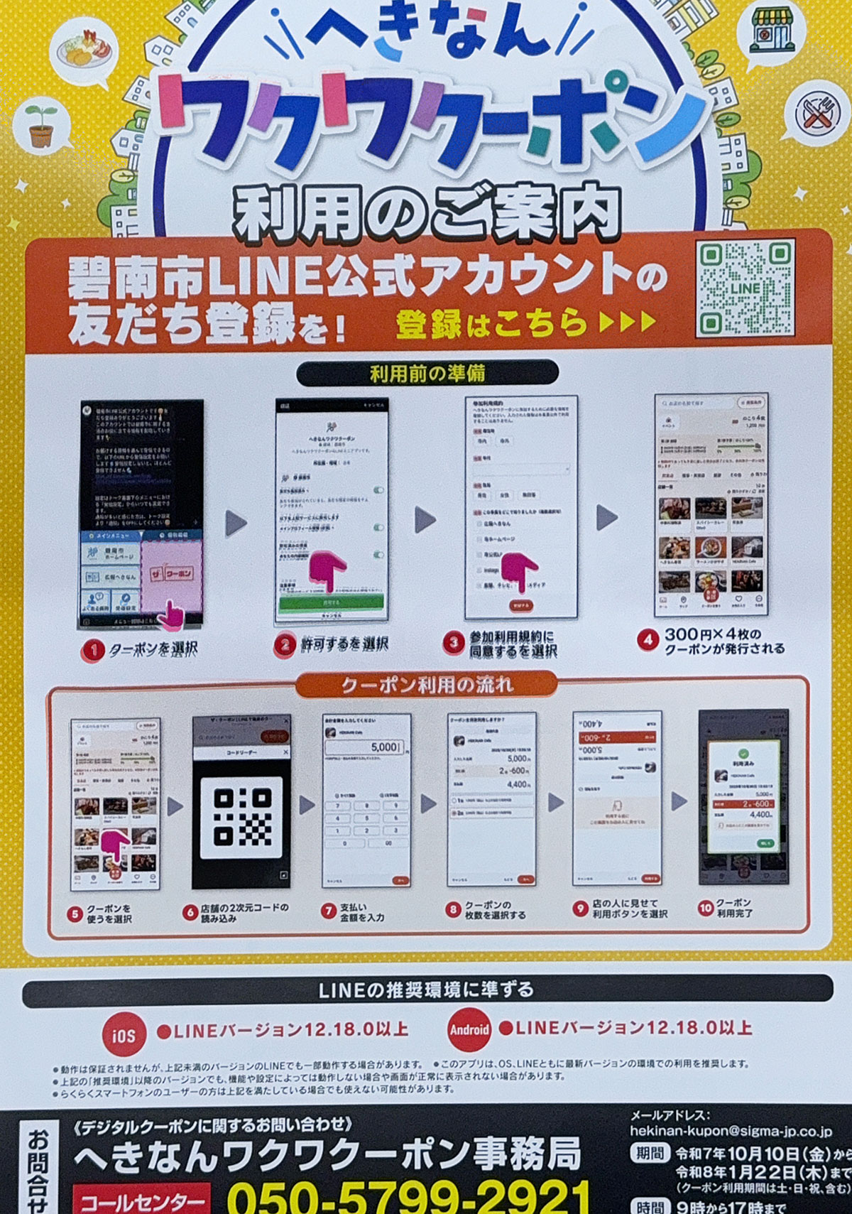 お問合せ「へきなんワクワクーポン事務局」コールセンター:050-5799-2921/時間9時~17時