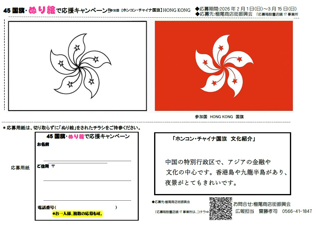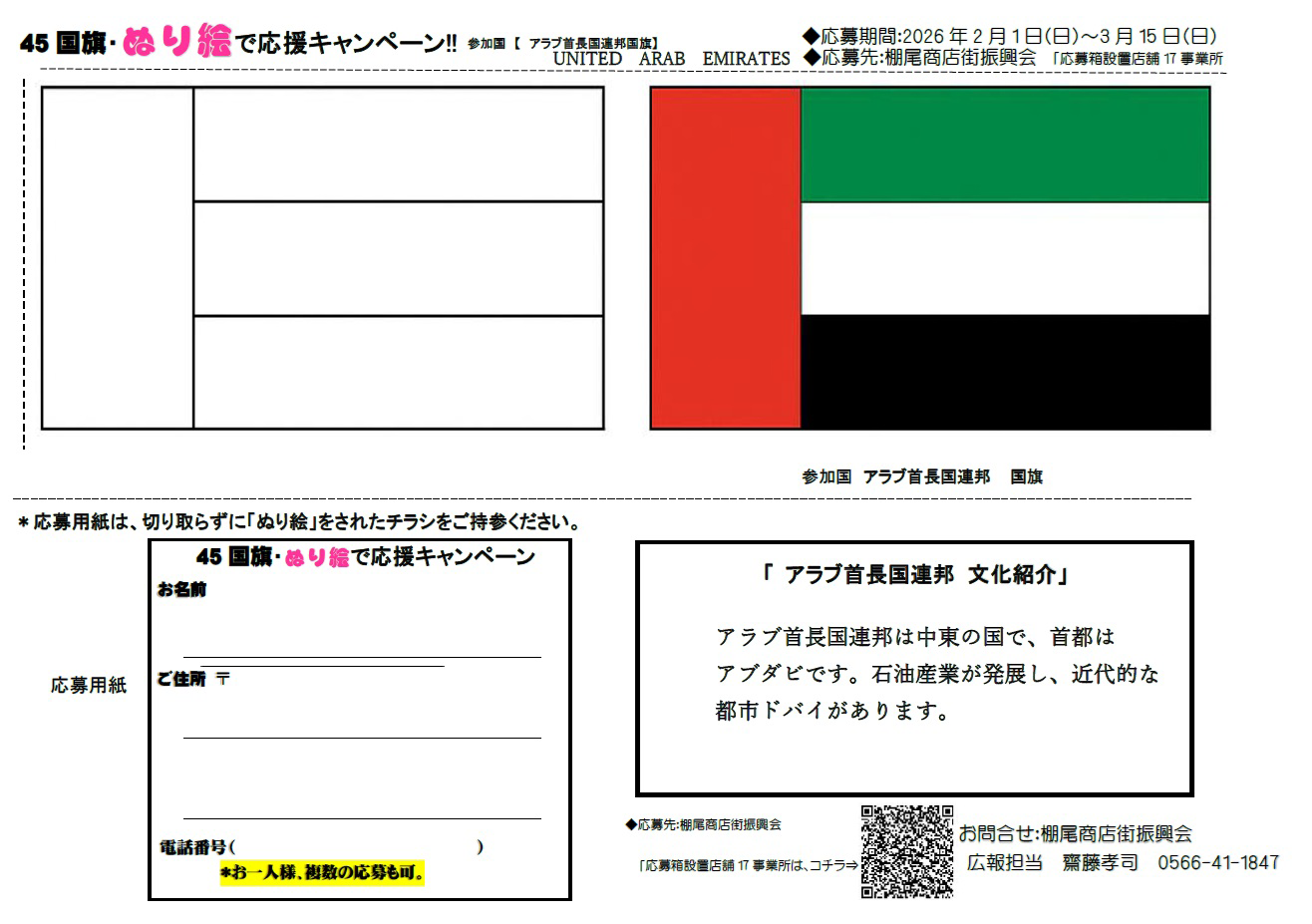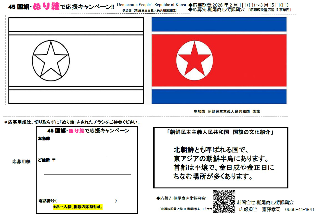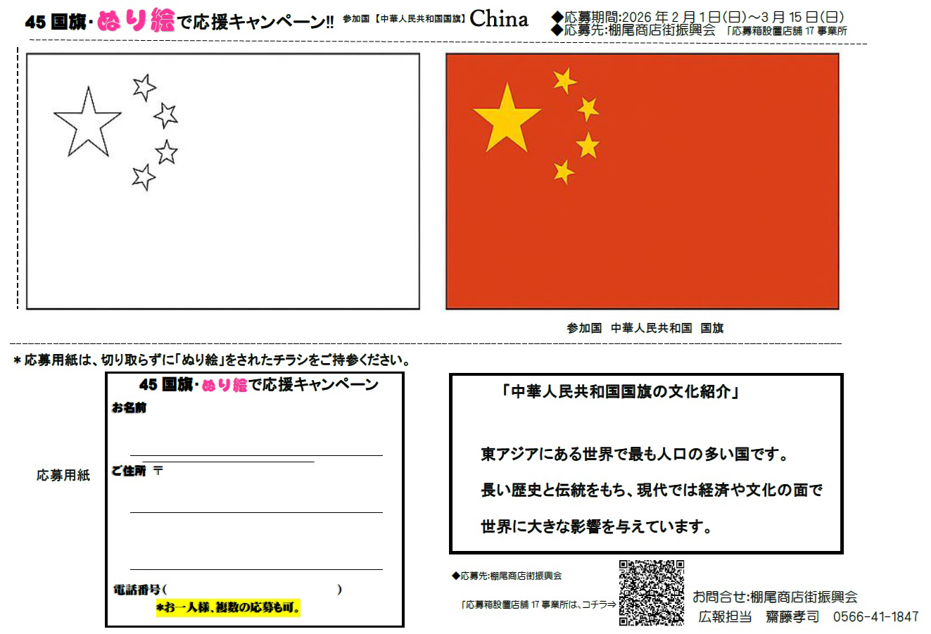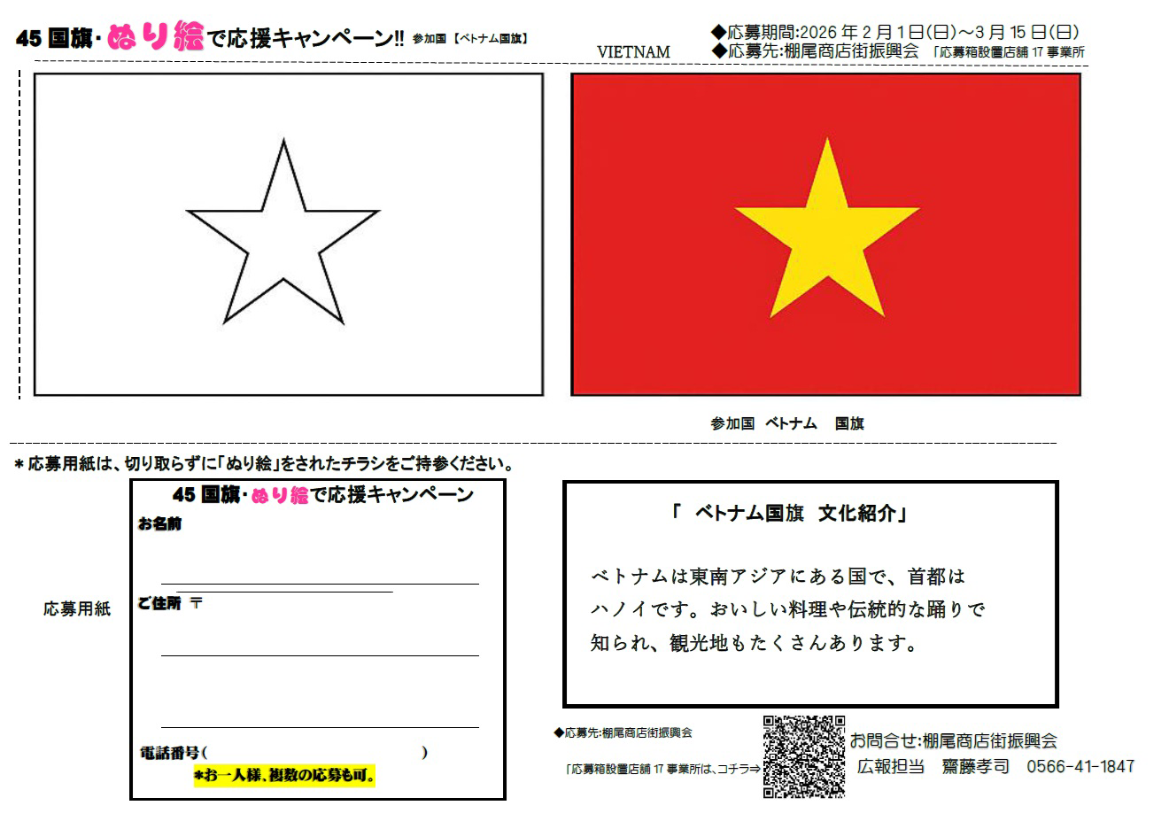 アジア45ヶ国・国旗の塗り絵をして頂き、参加店に応募して下さい。 応募の中から、100名様に商品券が当たります。また、「ぬり絵」をされた国旗はボランティアの方々がフラッグを制作し、市民の皆さんが、応援用フラッグとして使います。ぜひ、「ぬり絵」をして、世界の方々に喜んで頂きましょう。