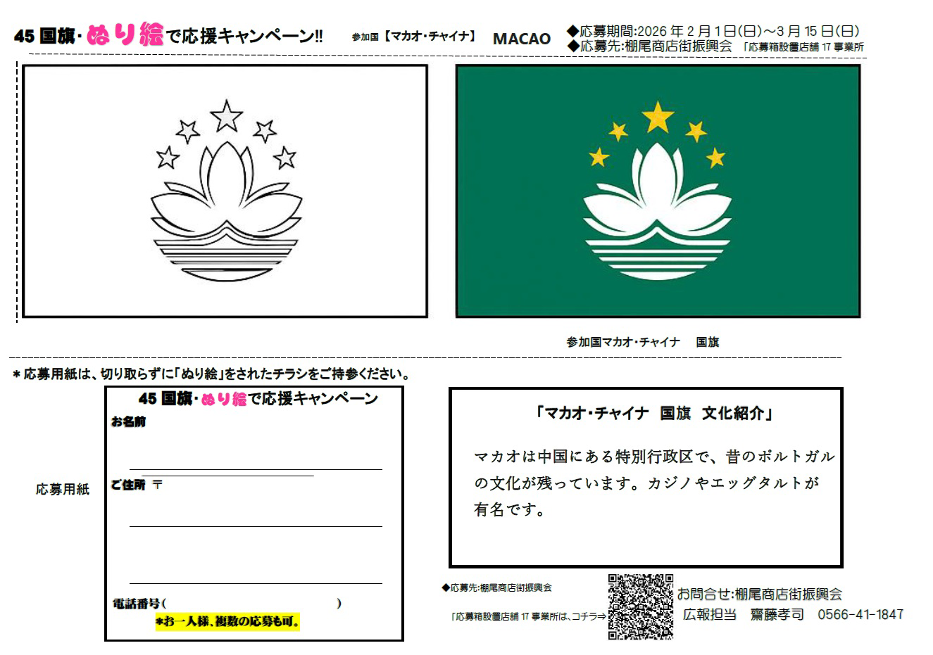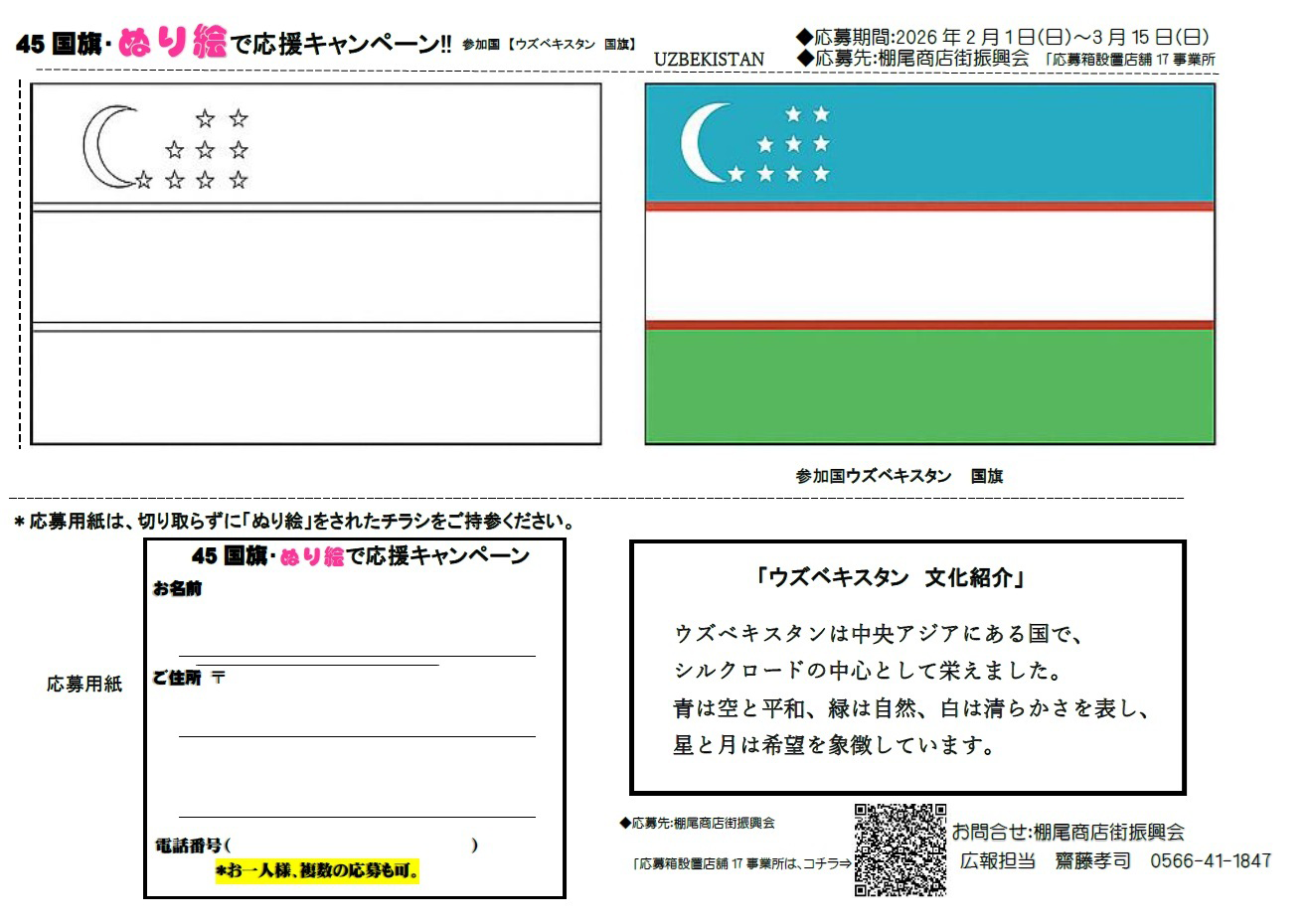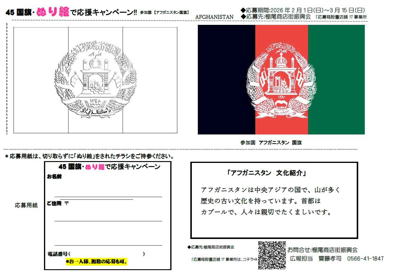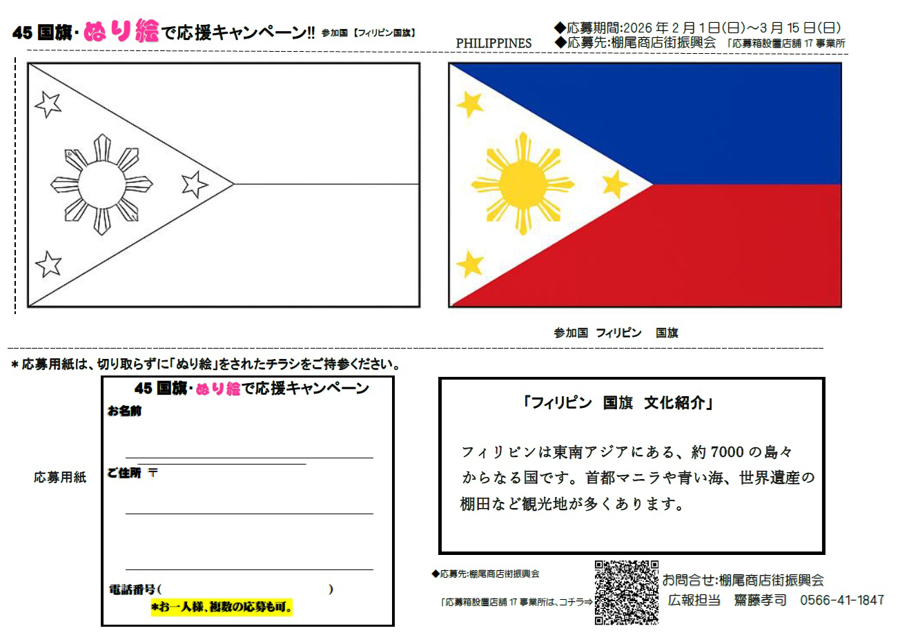 アジア45ヶ国・国旗の塗り絵をして頂き、参加店に応募して下さい。 応募の中から、100名様に商品券が当たります。また、「ぬり絵」をされた国旗はボランティアの方々がフラッグを制作し、市民の皆さんが、応援用フラッグとして使います。ぜひ、「ぬり絵」をして、世界の方々に喜んで頂きましょう。