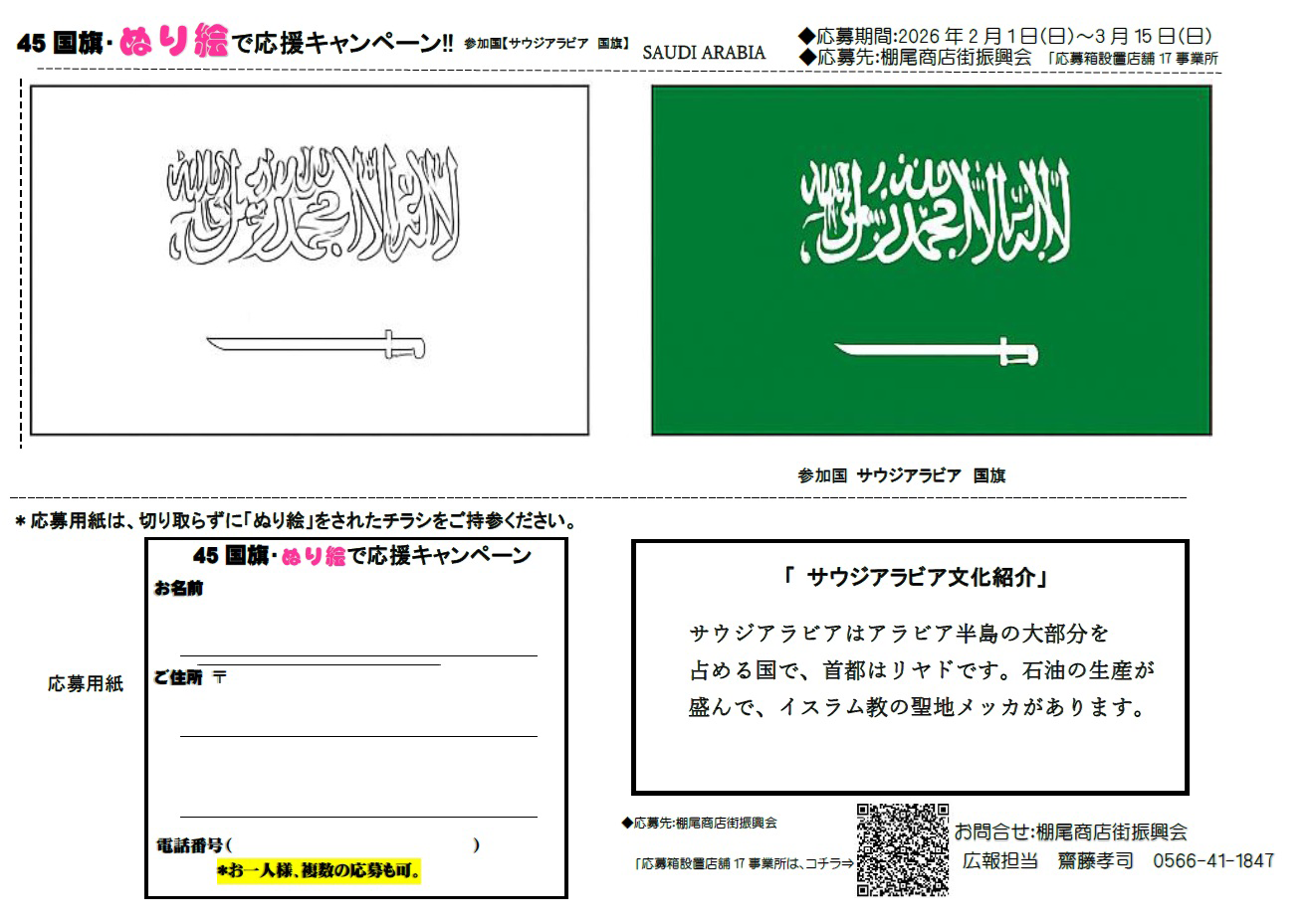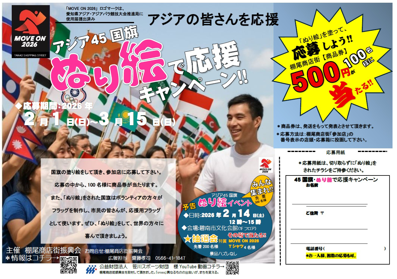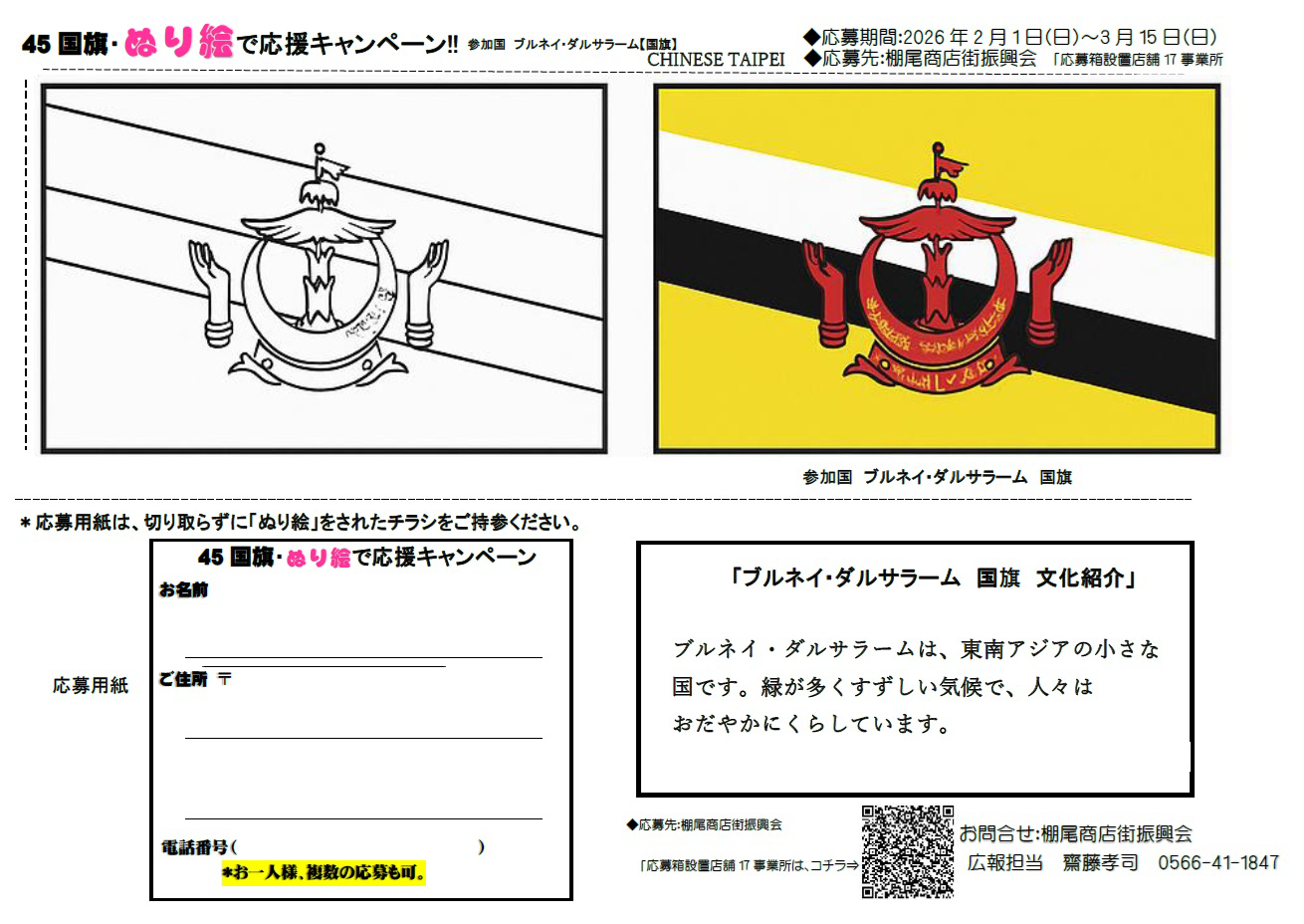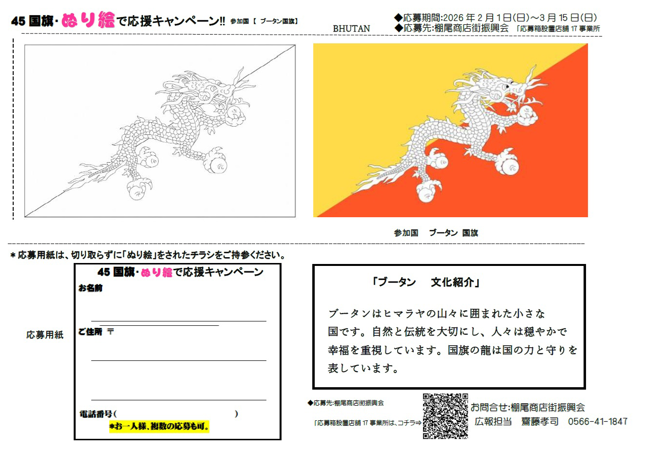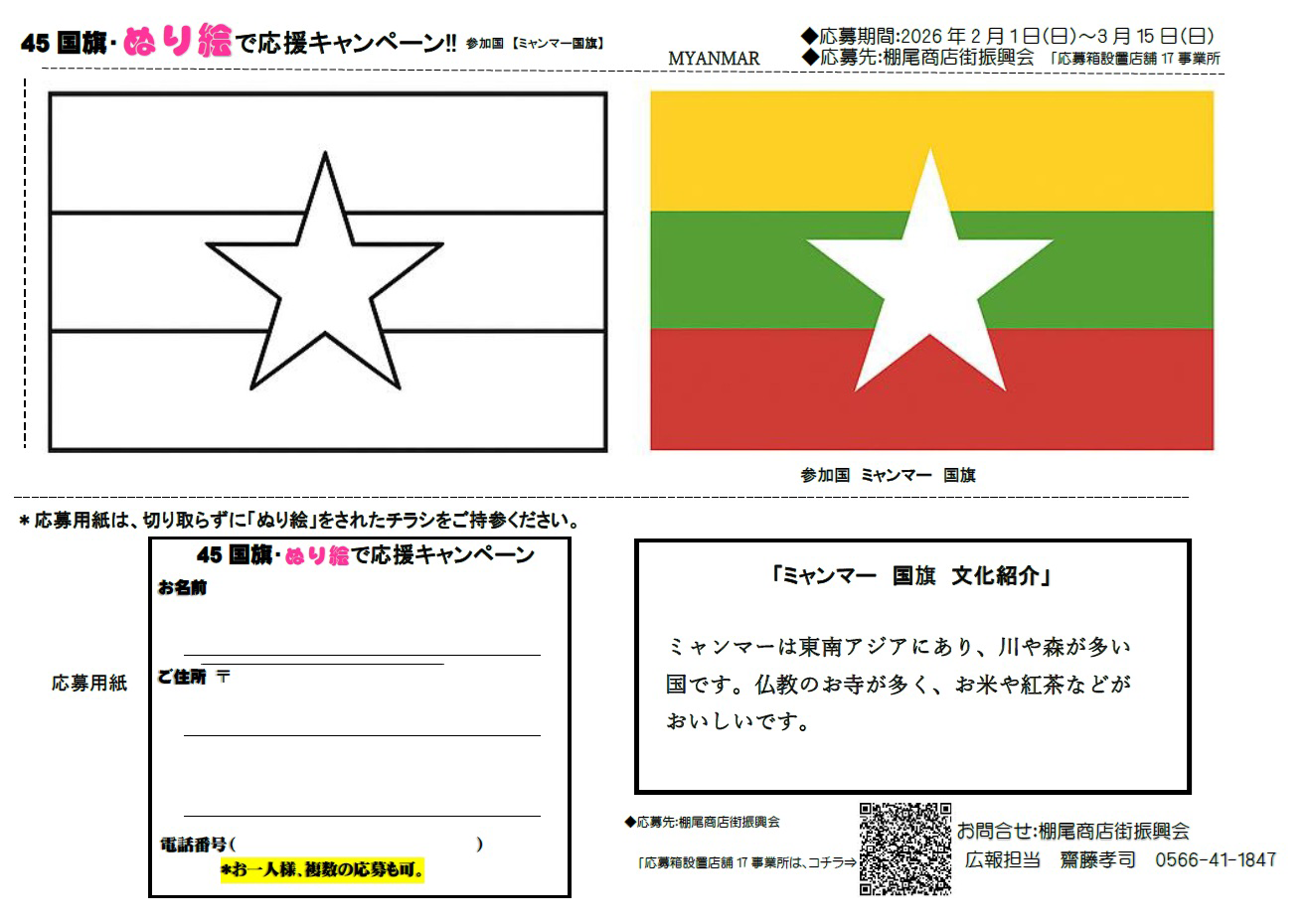 アジア45ヶ国・国旗の塗り絵をして頂き、参加店に応募して下さい。 応募の中から、100名様に商品券が当たります。また、「ぬり絵」をされた国旗はボランティアの方々がフラッグを制作し、市民の皆さんが、応援用フラッグとして使います。ぜひ、「ぬり絵」をして、世界の方々に喜んで頂きましょう。