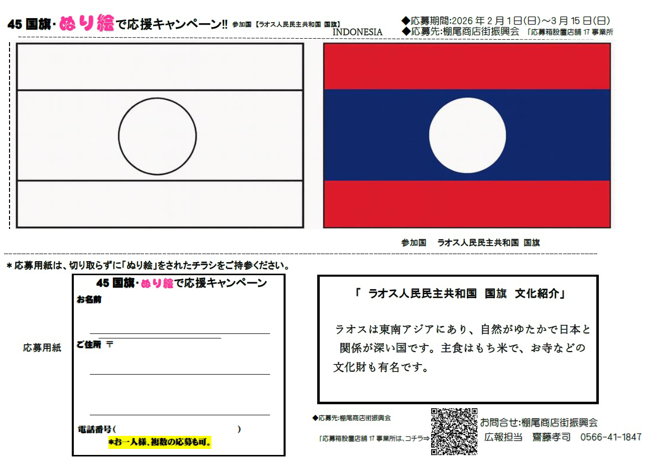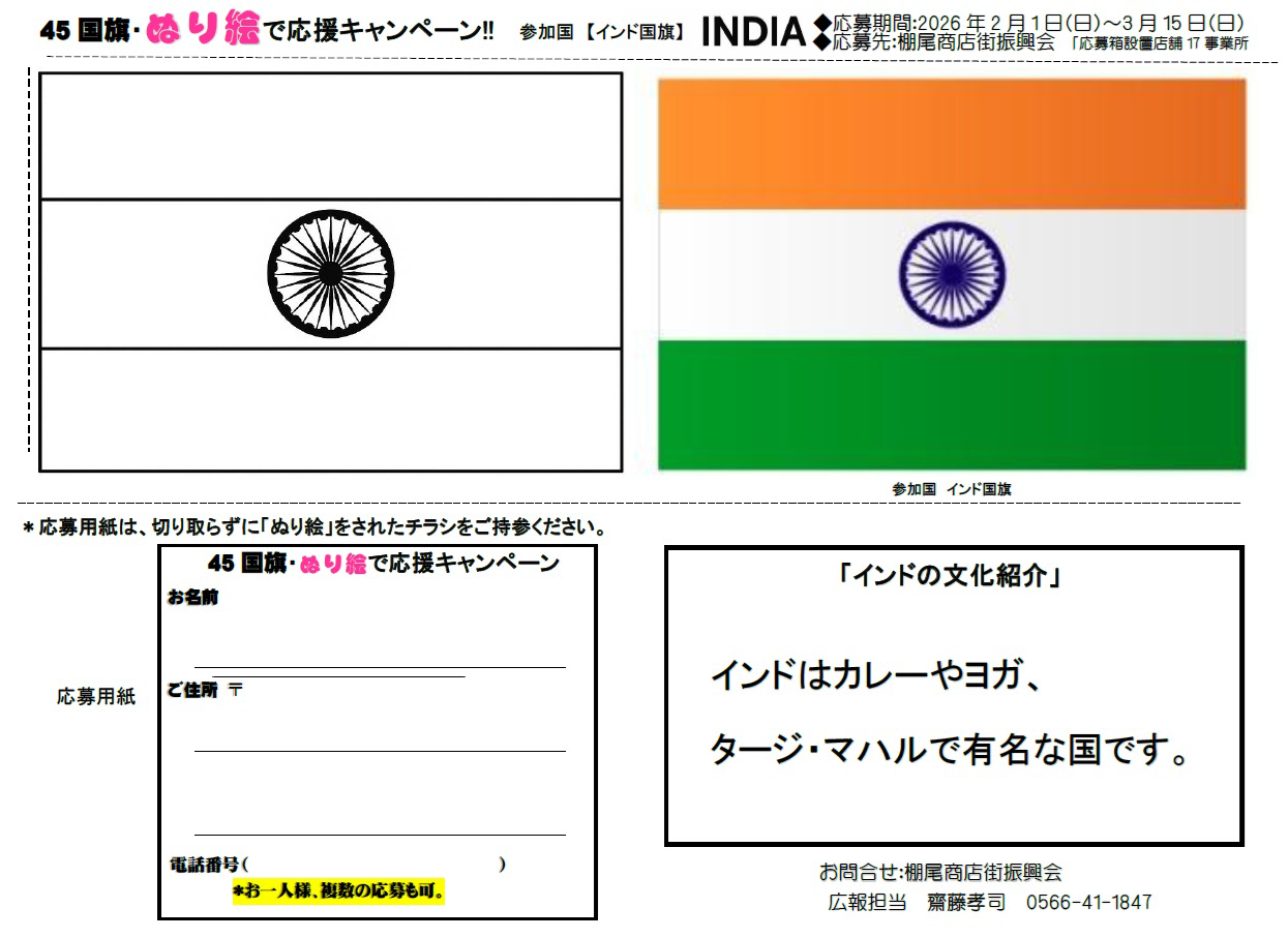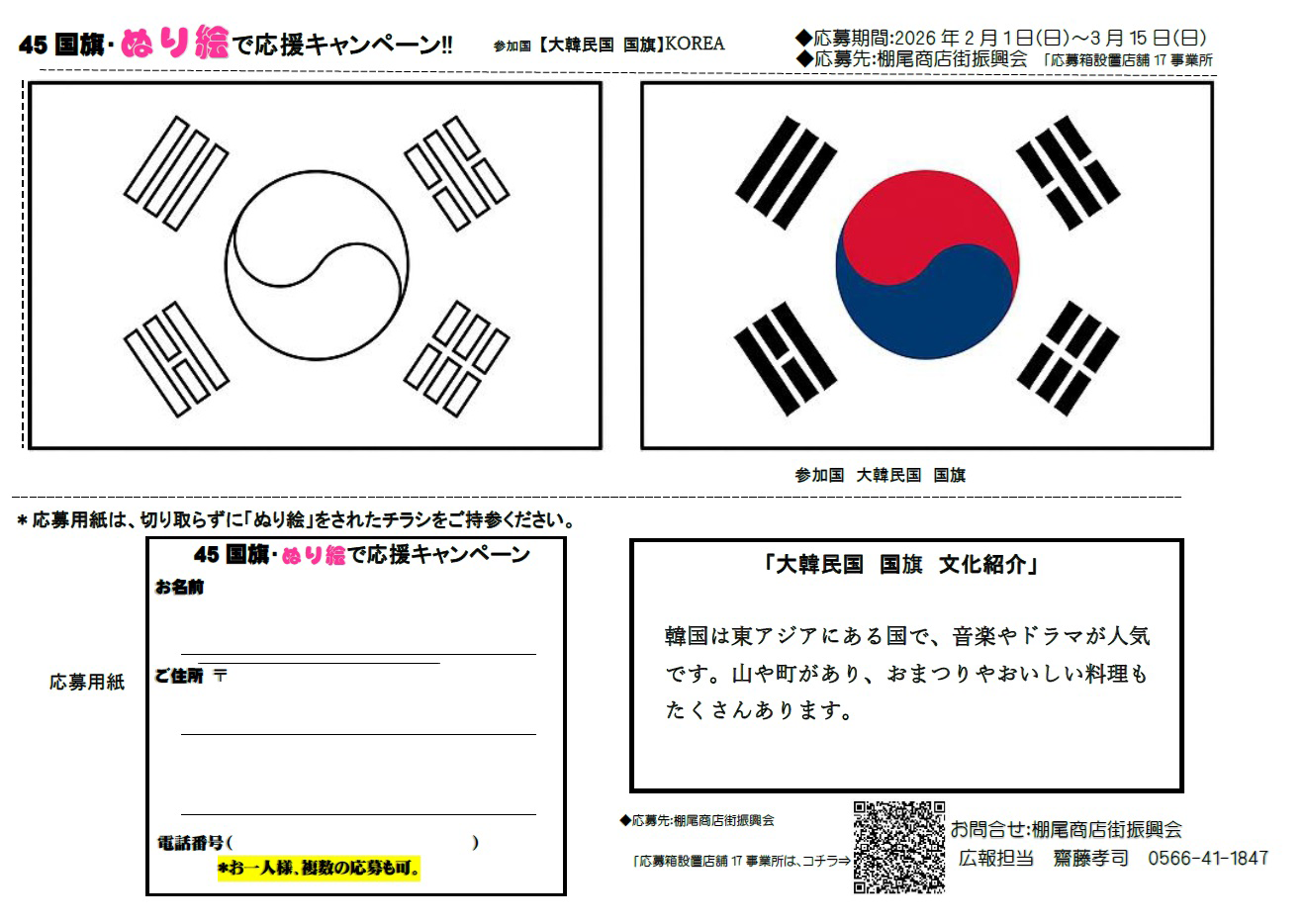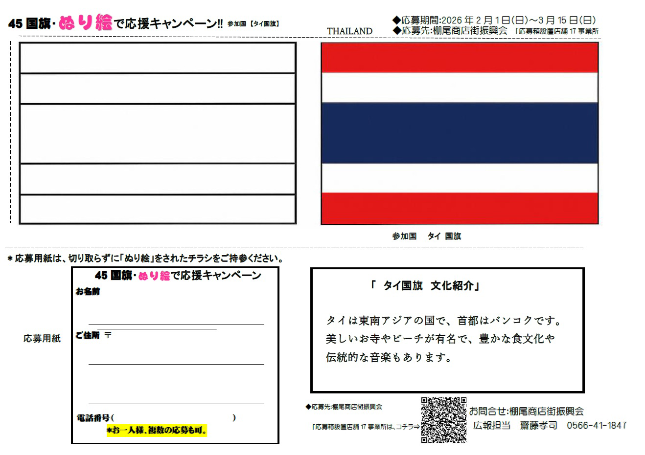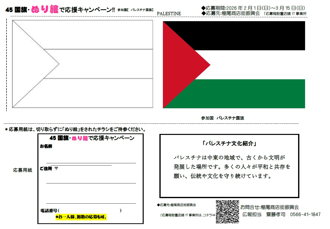 アジア45ヶ国・国旗の塗り絵をして頂き、参加店に応募して下さい。 応募の中から、100名様に商品券が当たります。また、「ぬり絵」をされた国旗はボランティアの方々がフラッグを制作し、市民の皆さんが、応援用フラッグとして使います。ぜひ、「ぬり絵」をして、世界の方々に喜んで頂きましょう。